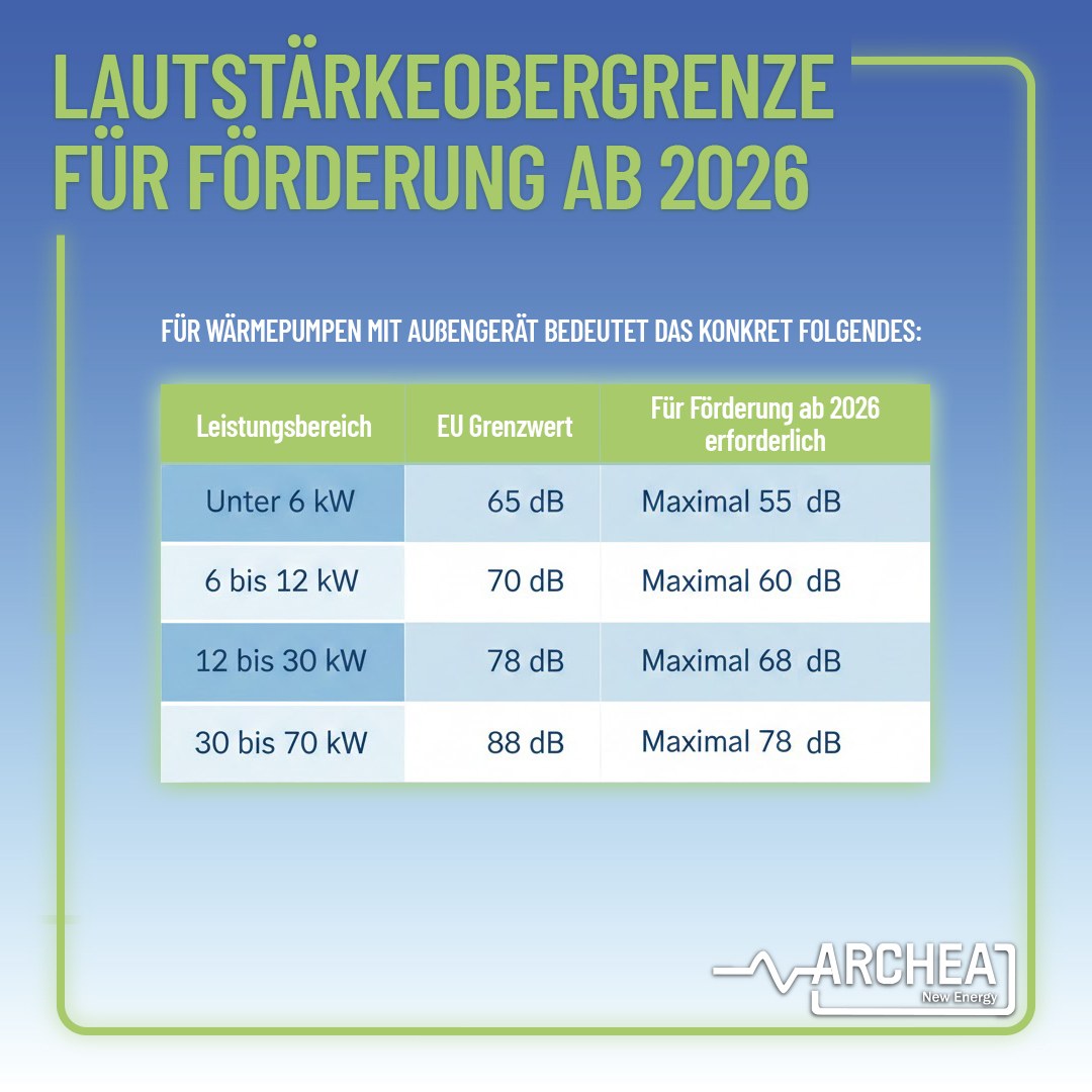 Für Eigentümerinnen und Eigentümer stellt sich selbstverständlich die Frage, was diese Änderungen für die eigene Modernisierung bedeuten und ob man überhaupt davon betroffen ist. Damit Sie Ihre Planung sicher ausrichten können, schauen wir uns an wie die neuen Lautstärkeregelungen ab 2026 genau aussehen und welche Leistungsbereiche betroffen sind.Ab dem 1. Januar 2026 gilt eine Wärmepumpe nur dann als förderfähig, wenn ihr Schallleistungspegel zehn Dezibel unter dem jeweiligen EU Grenzwert liegt. Das ist eine Verdopplung des bisher in Deutschland geforderten Abstands von fünf Dezibel. Die Hürde steigt damit spürbar, auch wenn sich die Änderung in Zahlen zunächst klein liest.